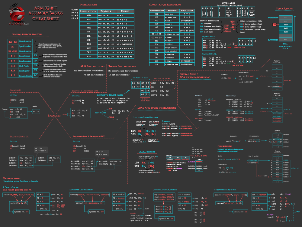 This cheat sheet is an extended version of the freely available ARM Assembly Basics cheat sheet from azeria-labs.com. It covers registers, basic instructions, load and store instructions, conditional execution, branching, literal pool, pc-relative addressing, and a full reverse shell in assembly.